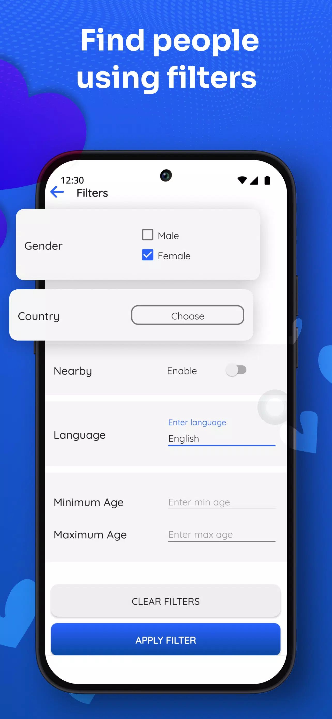 · Filter users by age, location, gender, and language to find the perfect match for your mood.