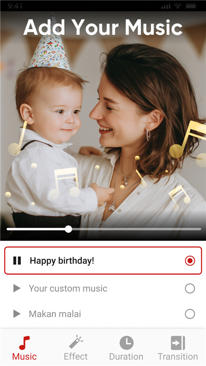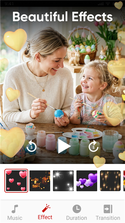 • Edit: Add your favorite music, select transition effects, and refine the timing.