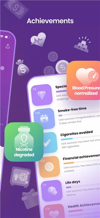 Smoxy rewards commitment with badges and achievements for smoke-free time, cigarettes avoided, money saved, and health progress. These positive reinforcements increase motivation and help sustain long-term behavioral change.