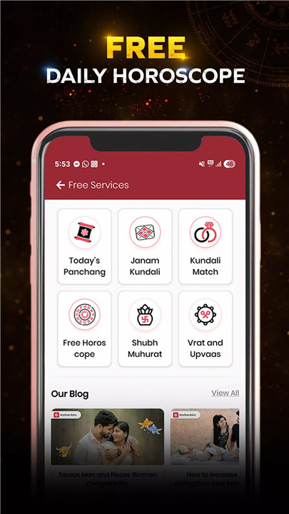 Anytime Astro offers a wide range of services to meet all your astrological needs. Enjoy free Kundli creation and compatibility matching, plus daily, weekly, monthly, and yearly horoscopes tailored just for you. Connect directly with verified astrologers through live chat or calls for personalized sessions. Participate in interactive live astrology events and explore remedies, spiritual guidance, and rituals available through our platform.
