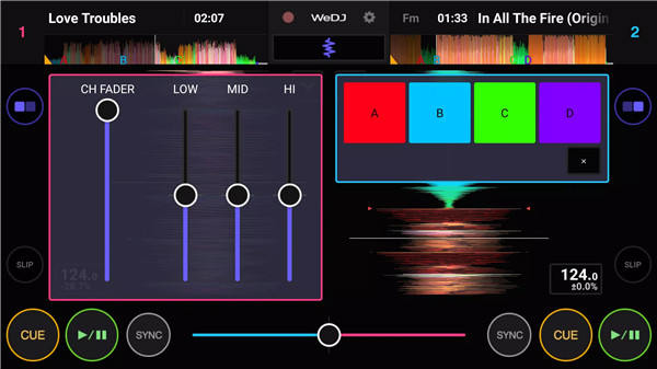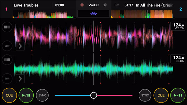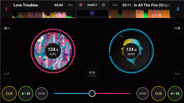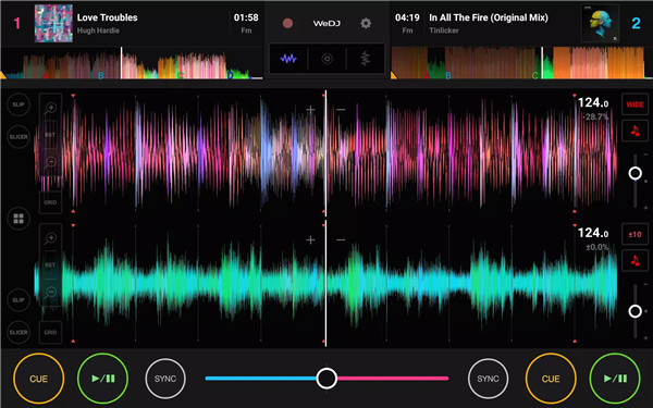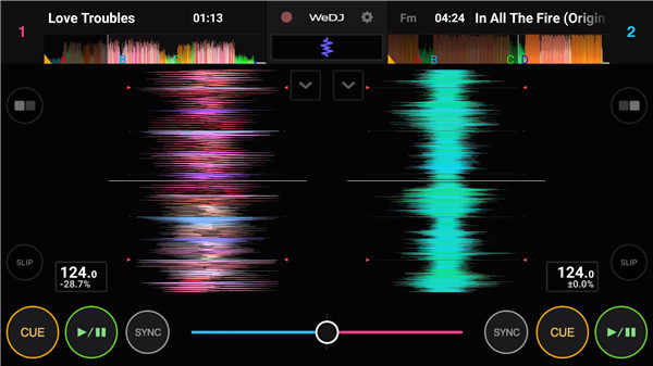 WeDJ features a dynamic 2-deck interface that mimics real DJ gear with jog wheels, cue/play buttons, tempo sliders, and a crossfader—giving you total control over your mix. The color-coded waveforms adapt to the track's album art, making it easier to track your mix visually.