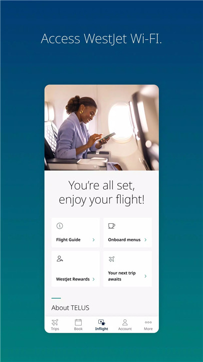 Enhance your travel experience with WestJet Connect. The app gives you access to a wide range of on-demand entertainment including movies, TV shows, and music stations—all for free. Select flights also offer complimentary WestJet Wi-Fi presented by TELUS, so you can stay connected above the clouds.