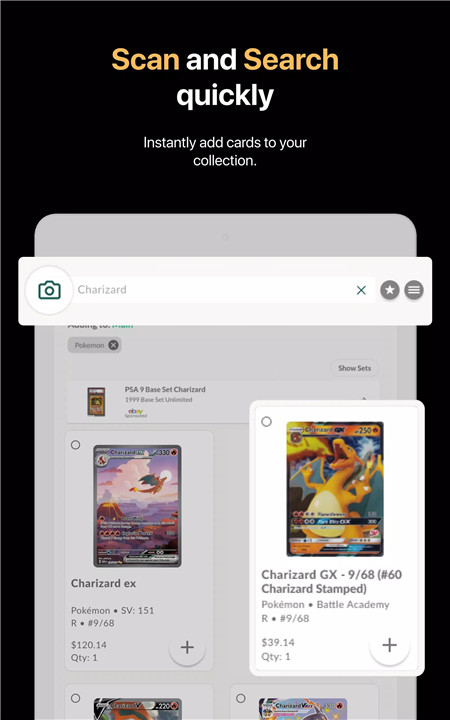 Scan cards instantly with advanced AI recognition. Collectr turns cataloging into a quick, seamless, and surprisingly fun experience. Add your items in seconds, manage multiple TCGs at once, and enjoy complete visibility over everything you own.