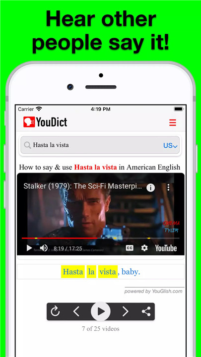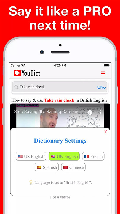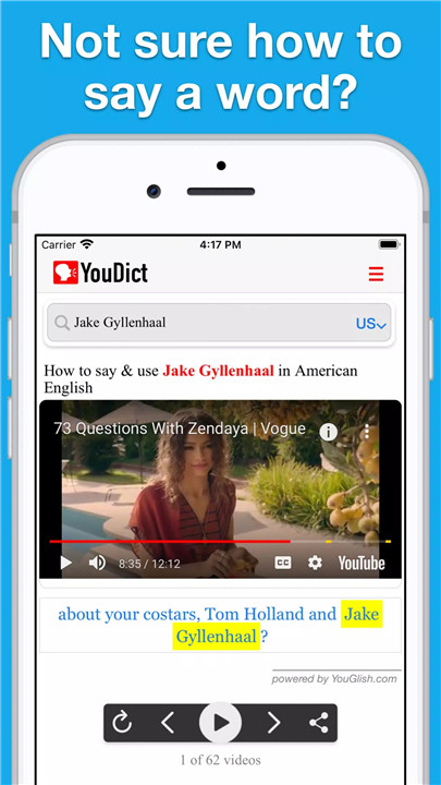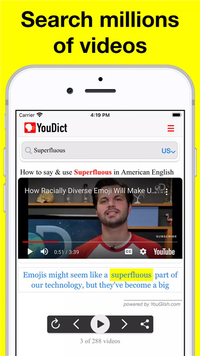 Simply search your word, and YouDict will play videos of native speakers pronouncing it. You can listen as many times as you like.