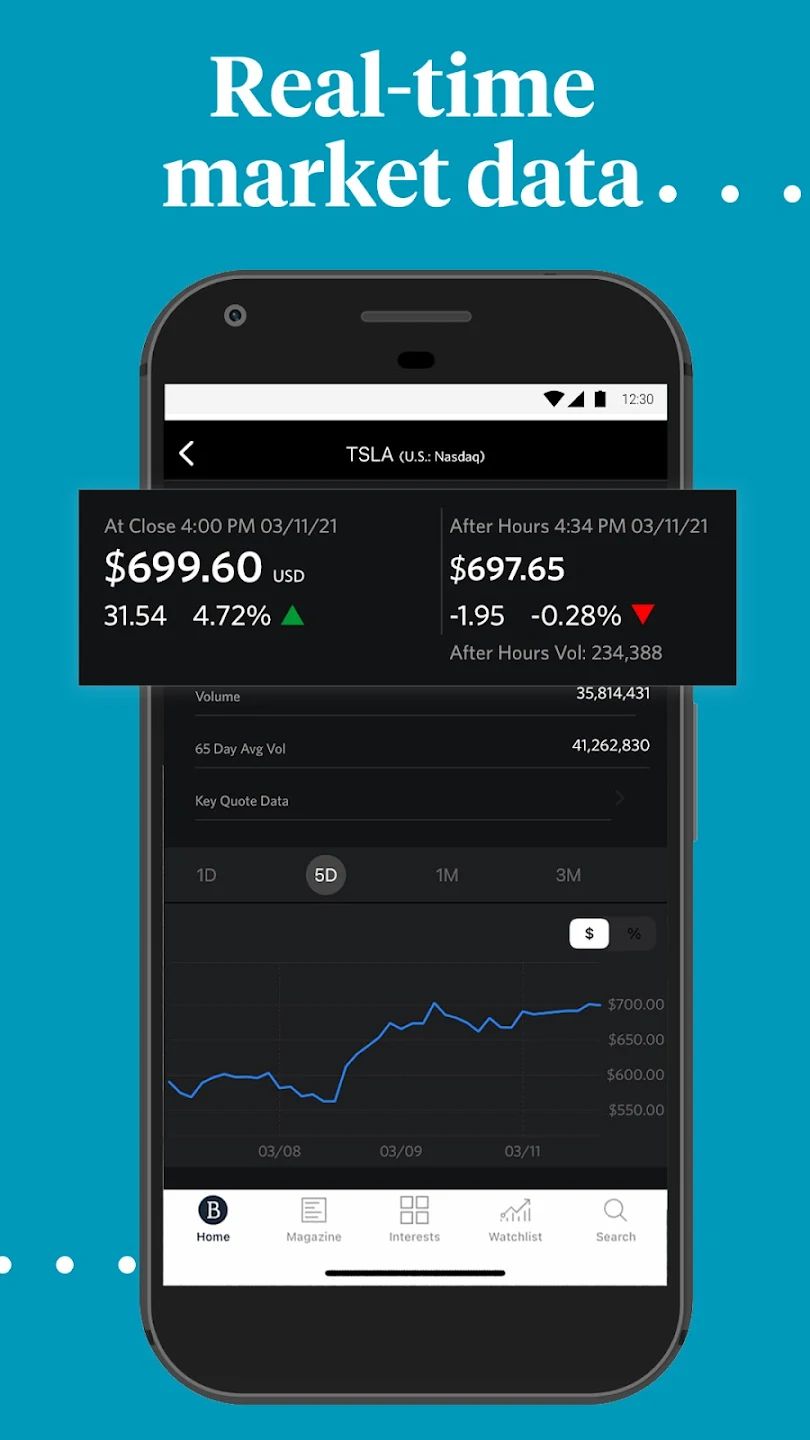 The app offers exclusive articles, market analysis, real-time stock data, interactive charts, watchlists, podcasts, and access to current and past print editions.