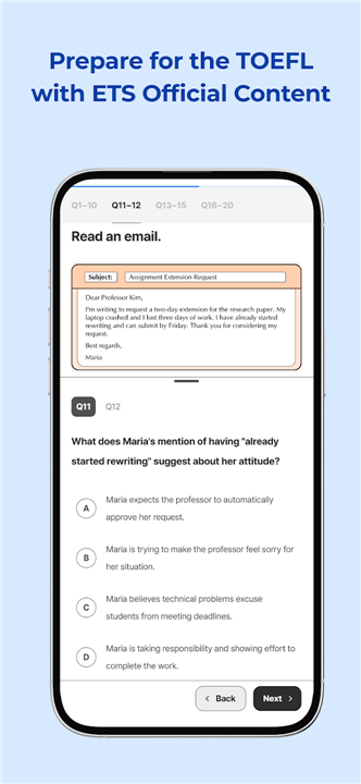 • Receive precise feedback on your Speaking and Writing performance using the official ETS evaluation criteria.