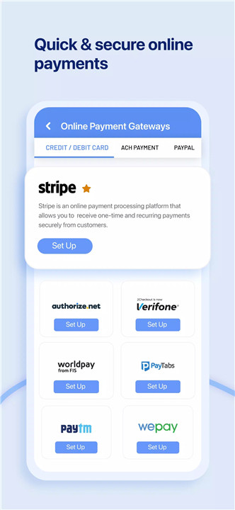 6. Faster Payments Speed up your cash flow with multiple payment options. Zoho Invoice supports credit and debit card transactions, ACH transfers, and more. You can also automate payment reminders to ensure timely payments and reduce the hassle of follow-ups.