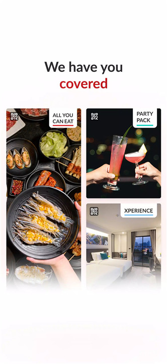 Packages include All You Can Eat, Party Packs, Hungry@Home delivery, and Xperience for vacations and special activities.