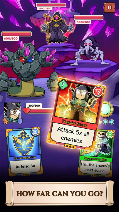Battles are turn-based and tactical, where timing and card synergy determine success. Each card played can shift the balance between victory and defeat, rewarding careful planning and adaptability.