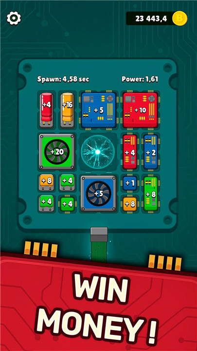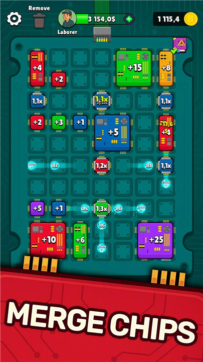 Start your journey by placing chips on your microcircuit. Each chip contributes to your income and helps build a more intricate and profitable system. The more chips you add, the bigger your microcircuit grows, giving you more options for upgrades and merges.
