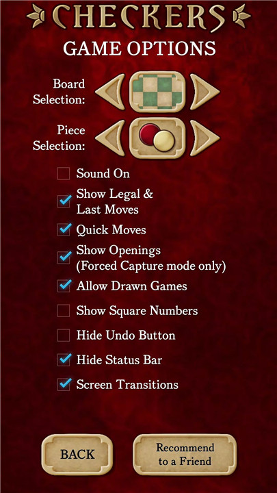 The game offers six different Checkers piece sets and seven board designs, allowing players to personalize their gaming experience.