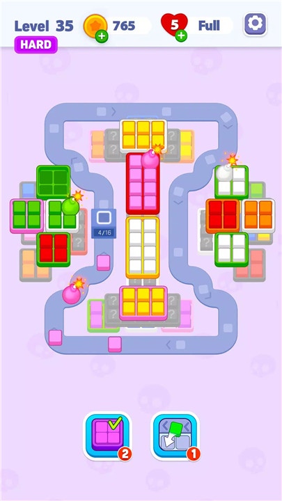 Not only cubes appear on the board. Some crates require different object shapes, with silhouette slots guiding correct placement. Pieces automatically fill when both shape and color match, adding depth to the sorting mechanic.