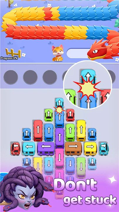 Navigate through parking lot puzzles where you must strategically guide cars of matching colors to exit, providing the ammunition needed to shoot down the snake. Every move counts in this high-stakes rescue mission. If the snake reaches the cats, it’s game over—so think fast and act smarter!