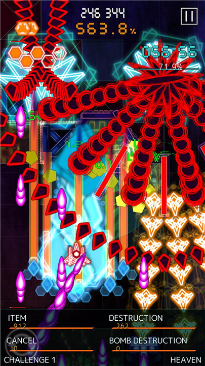 Challenge mode is designed for players seeking intense bullet hell action. Players can select from EASY, NORMAL, HARD, and HEAVEN difficulties. Upgraded ships can be brought into this mode, maximizing firepower and survivability. High scores achieved in Challenge mode are tracked in online rankings, allowing players to compete with others globally.