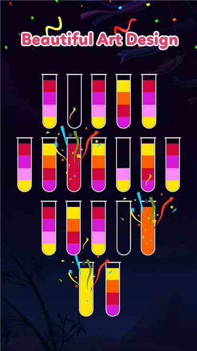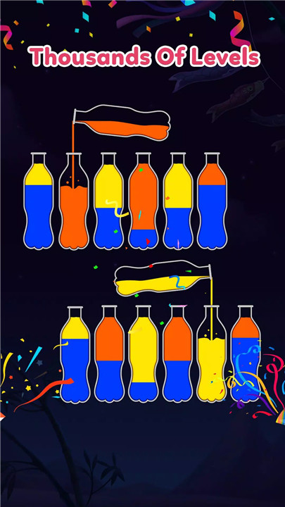 Playing is easy! Tap on a bottle and pour its water into another bottle. You can only pour if the top colors match and there’s enough space to hold the water. Keep organizing the colorful liquids until each bottle contains a single color. Stuck on a level? Use boosters or restart to try again—no pressure, just pure fun!