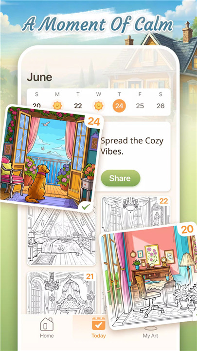 Every coloring session is crafted to evoke a sense of serenity. Gentle tones, cozy themes, and thoughtfully designed visuals create a comforting environment that helps ease tension and promote mindfulness. Each completed piece reflects warmth, belonging, and quiet happiness.