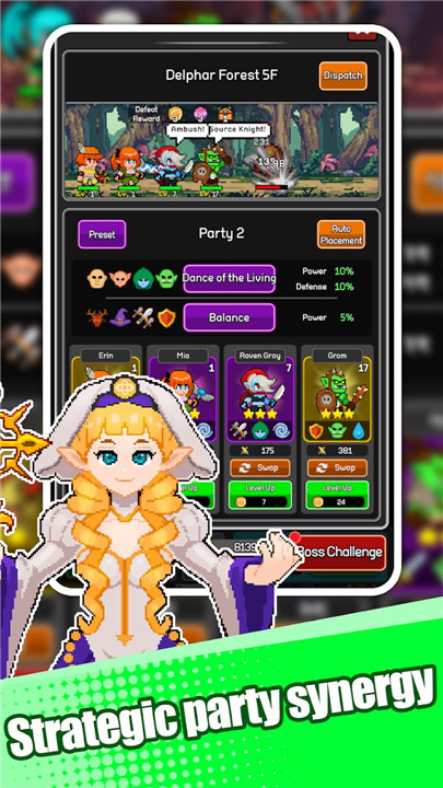 This idle RPG introduces the unprecedented ability to train and control 32 heroes simultaneously. Form squads of four to create eight parties that operate at once, offering a management experience equivalent to running eight games simultaneously. Players can optimize growth, leveling, and equipment across all heroes for maximum impact.