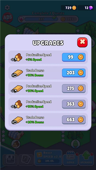 Beyond local facility upgrades, players can enhance production speed and boost profit for specific material types. These global upgrades persist across levels, ensuring steady progress throughout the entire game.