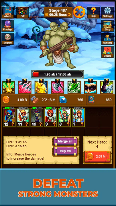 Idle Pixel Heroes: Idle Merger is a thrilling blend of idle RPG mechanics and strategic merging gameplay, wrapped in nostalgic pixel art. This is more than just a typical idle game—it's a deep, rewarding journey through stages, dungeons, raids, and an ever-expanding world filled with powerful heroes and pets.