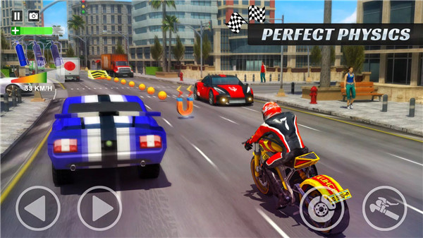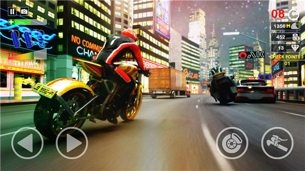 With stunning 3D graphics and smooth game controls, Turbo Racer delivers a console-like bike racing experience right on your mobile device. Watch as cityscapes and traffic environments rush by in beautiful detail.