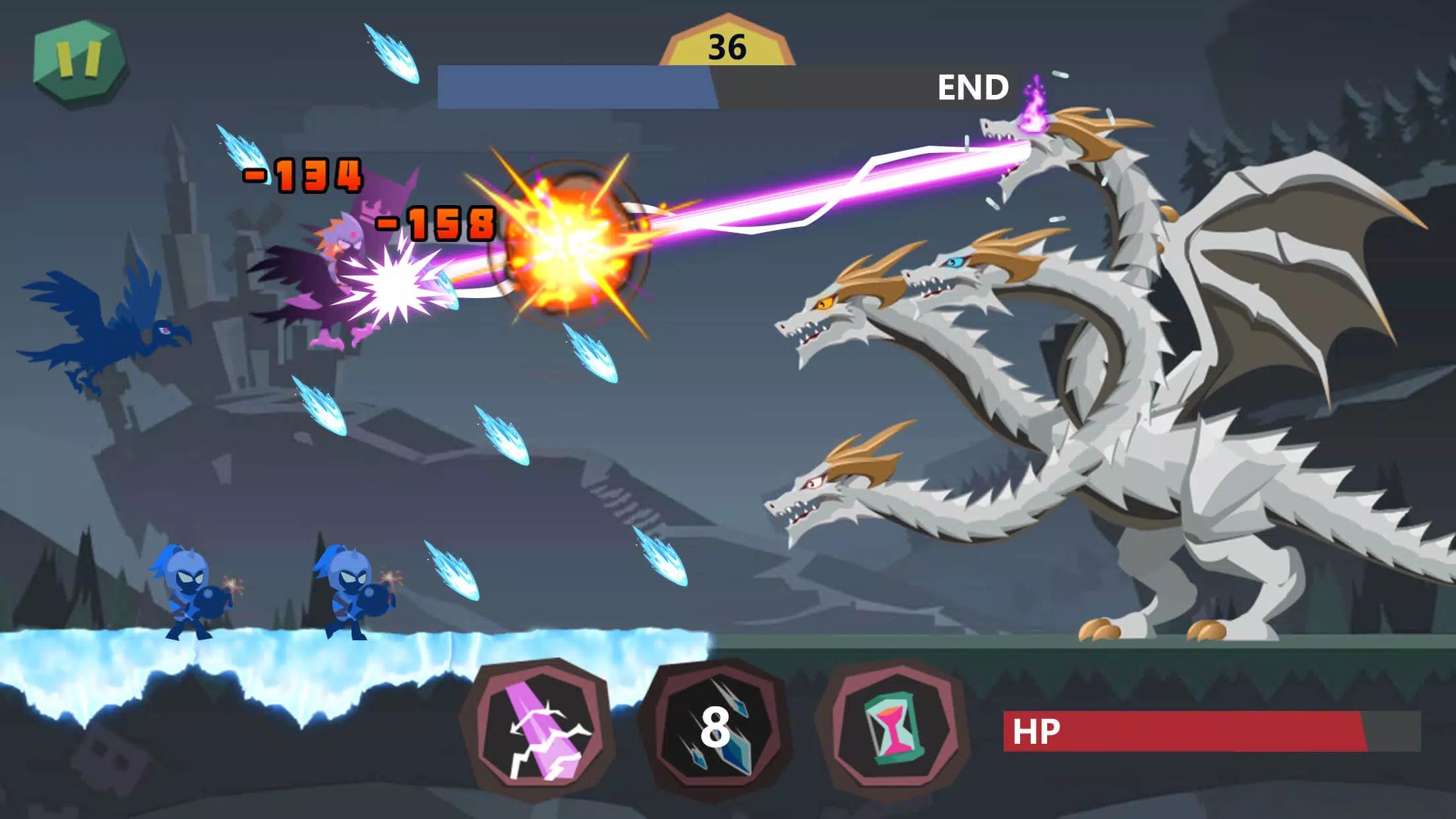 Players tap on a dragon head and swipe the screen to release its elemental power, targeting enemies strategically.