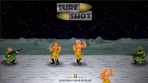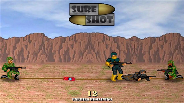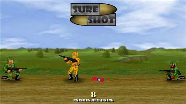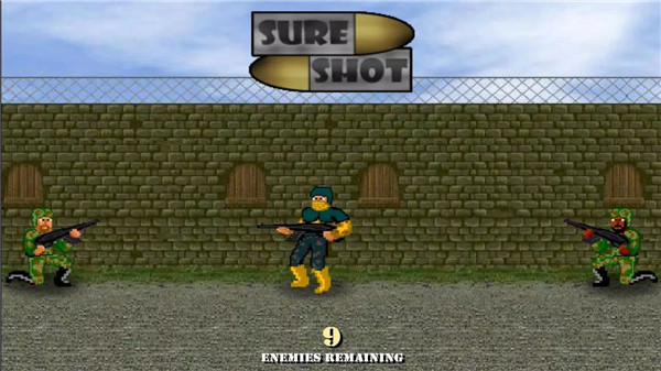 Sure Shot features 10 different enemy types, each with distinct behaviors and attack patterns. Players must adapt their strategies to defeat the diverse foes while avoiding hitting unarmed hostages. The game is set across 10 unique battlefields, each with its own challenges and environmental features. This variety ensures that every mission feels distinct, encouraging players to refine their skills and strategies as they progress.
