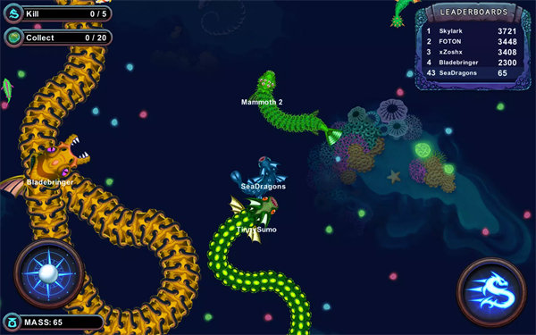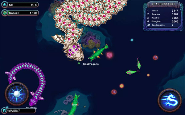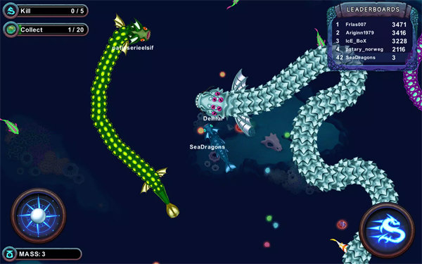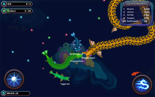 Players navigate their sea dragons through fluid controls, allowing for quick turns and agile maneuvers. Mastering movement is key to both evasion and attacking other players.- Growth Mechanic: