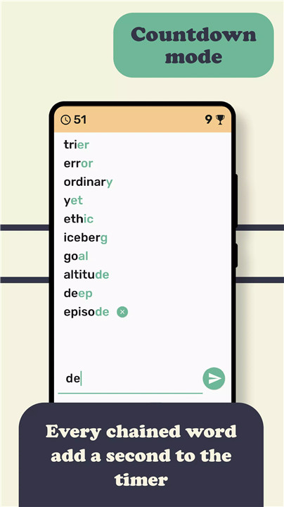 The Countdown mode introduces a fast-paced challenge where players must create as many words as possible within 60 seconds. The objective is to build the longest chain before the timer runs out. This mode encourages quick thinking and rapid word recall, making it an exciting test of both speed and vocabulary.