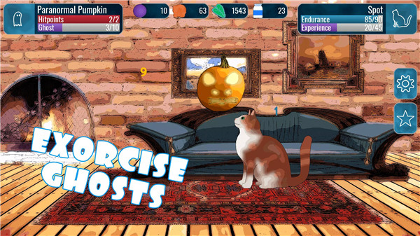 Cats can exorcise over 80 different ghosts using their paws and magical abilities. Hand-animated ghosts each have unique designs and behaviors, providing diverse combat experiences. Active tapping battles are complemented by idle gameplay, allowing players to progress even when away.
