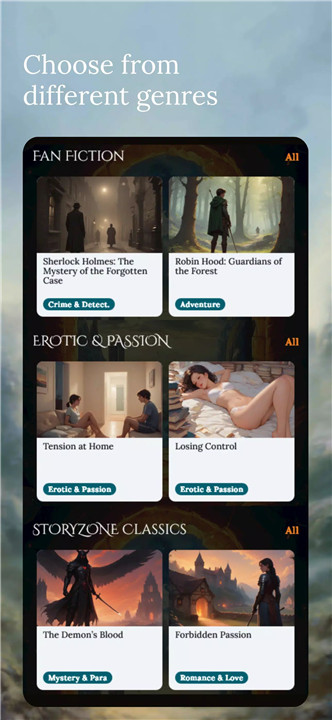 StoryZone doesn’t limit your imagination. From epic fantasy and sci-fi adventures to slice-of-life dramas and steamy romance stories, the app supports a wide range of genres.