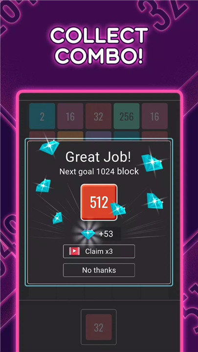 Players tap and shoot number blocks onto the board, connecting identical numbers vertically or horizontally to merge them into doubled values.