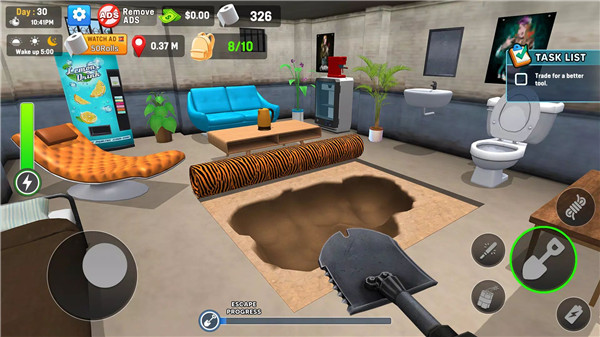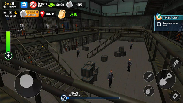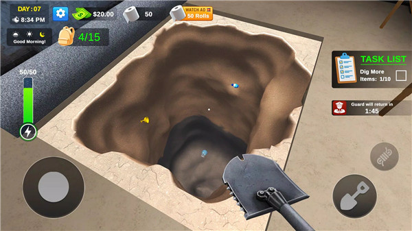 Escape begins beneath the surface. Players dig tunnels using realistic mechanics that require careful management of energy, time, and tools. Starting with basic items like a mug, progression unlocks stronger tools such as durable shovels and ropes, making each step toward freedom more efficient yet increasingly risky.