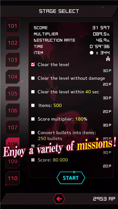 Each chapter contains a variety of missions ranging from simple tasks to more demanding challenges. Objectives such as “Defeat 30 enemies!” encourage focused gameplay and steady improvement. Completing missions unlocks boss stages, and defeating these powerful enemies allows progression to the next chapter. This structure provides consistent direction while maintaining replay value.